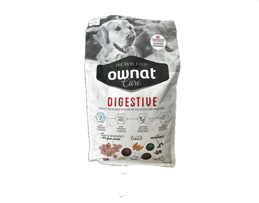 Comida para perros. OWNAT CARE DIGESTIVE está indicado para perros con el tracto gastrointestinal sensible. Está elaborado de manera cuidadosa con ingredientes naturales, probióticos y prebióticos para favorecer la salud intestinal, promoviendo una flora intestinal equilibrada y una óptima digestión.