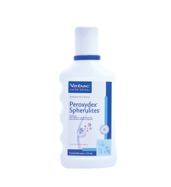 El Peroxydex Spherulites es un shampoo dermatológico a base de peróxido de benzoilo, recomendado para perros con piel seborreica, foliculitis o dermatitis. Su acción controla la grasa y ayuda a reducir la proliferación bacteriana.
